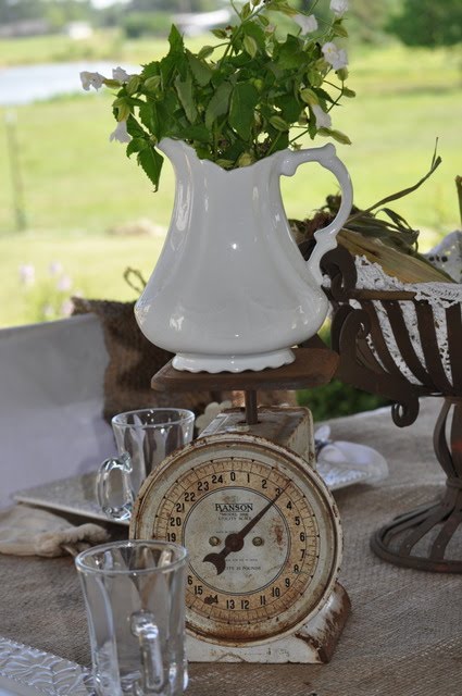 What a pretty table you set! I love the use of the old scale and the plates are so pretty too!!