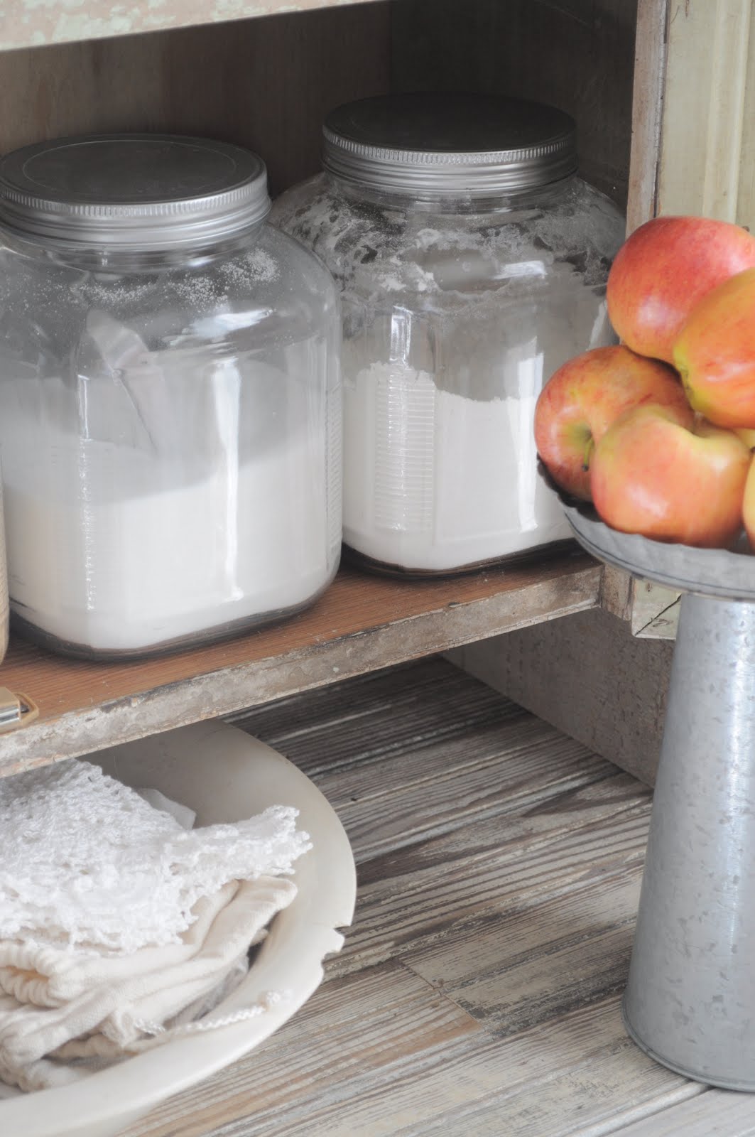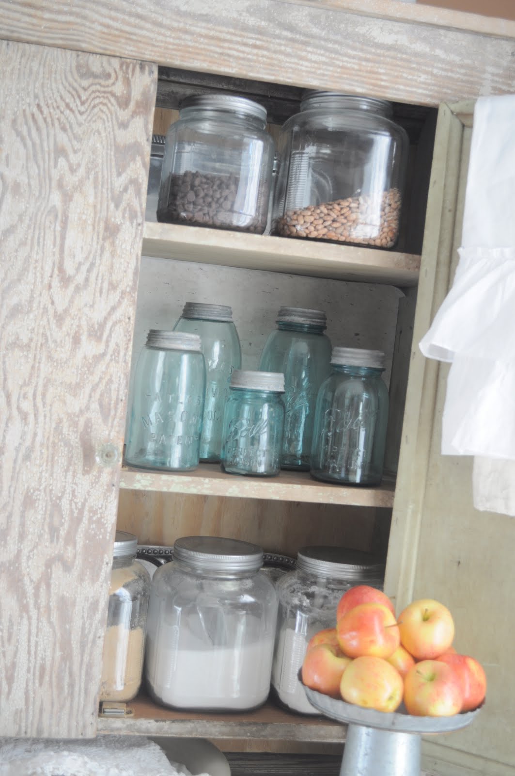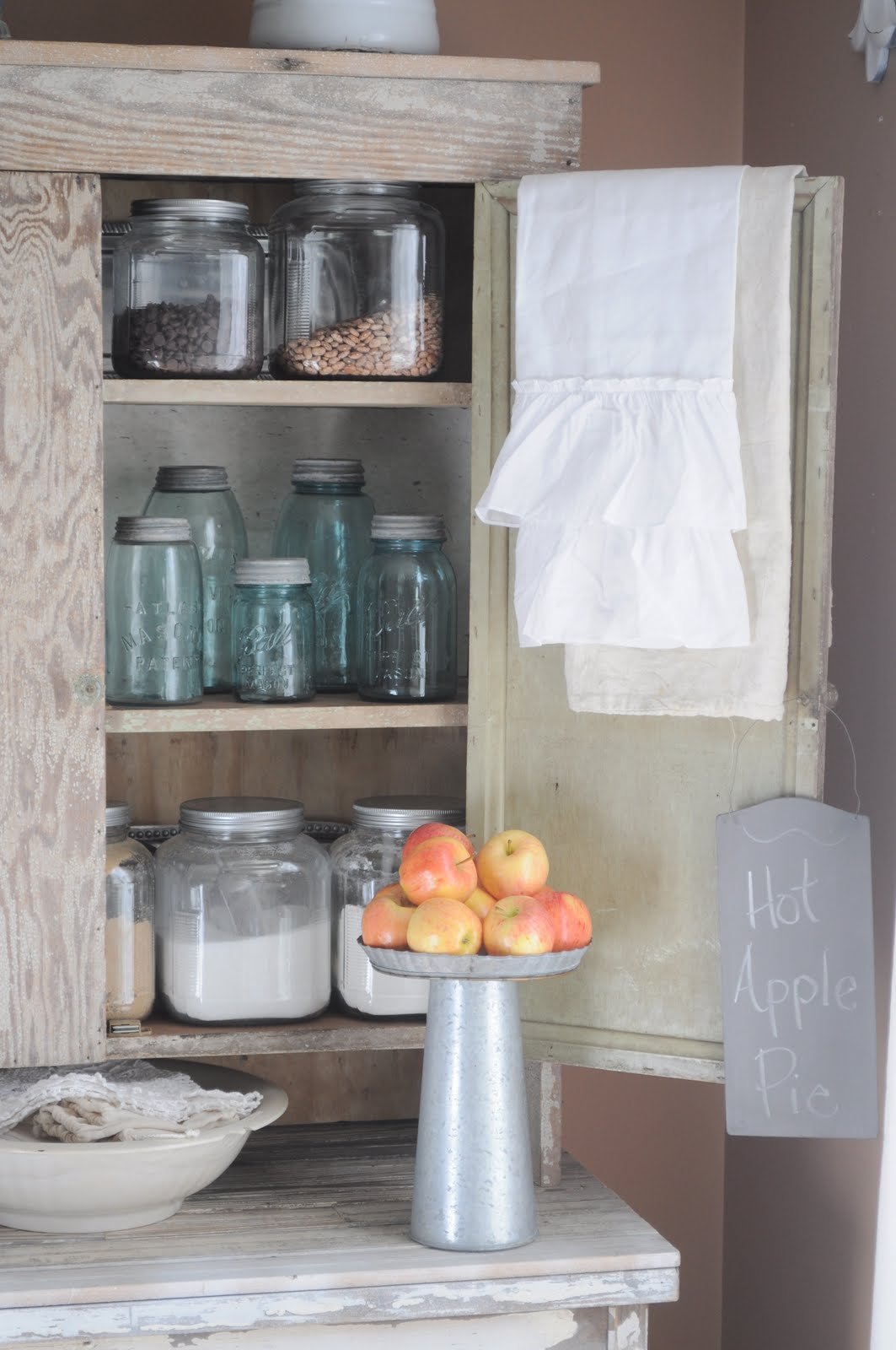What a great hutch. I love the old wood on this and all of those wonderful jars. They look great in there.