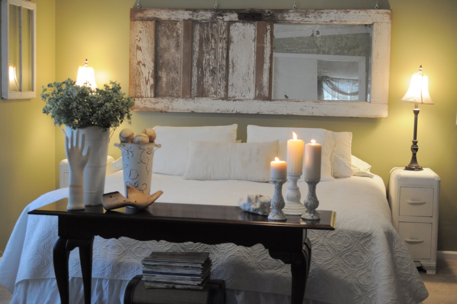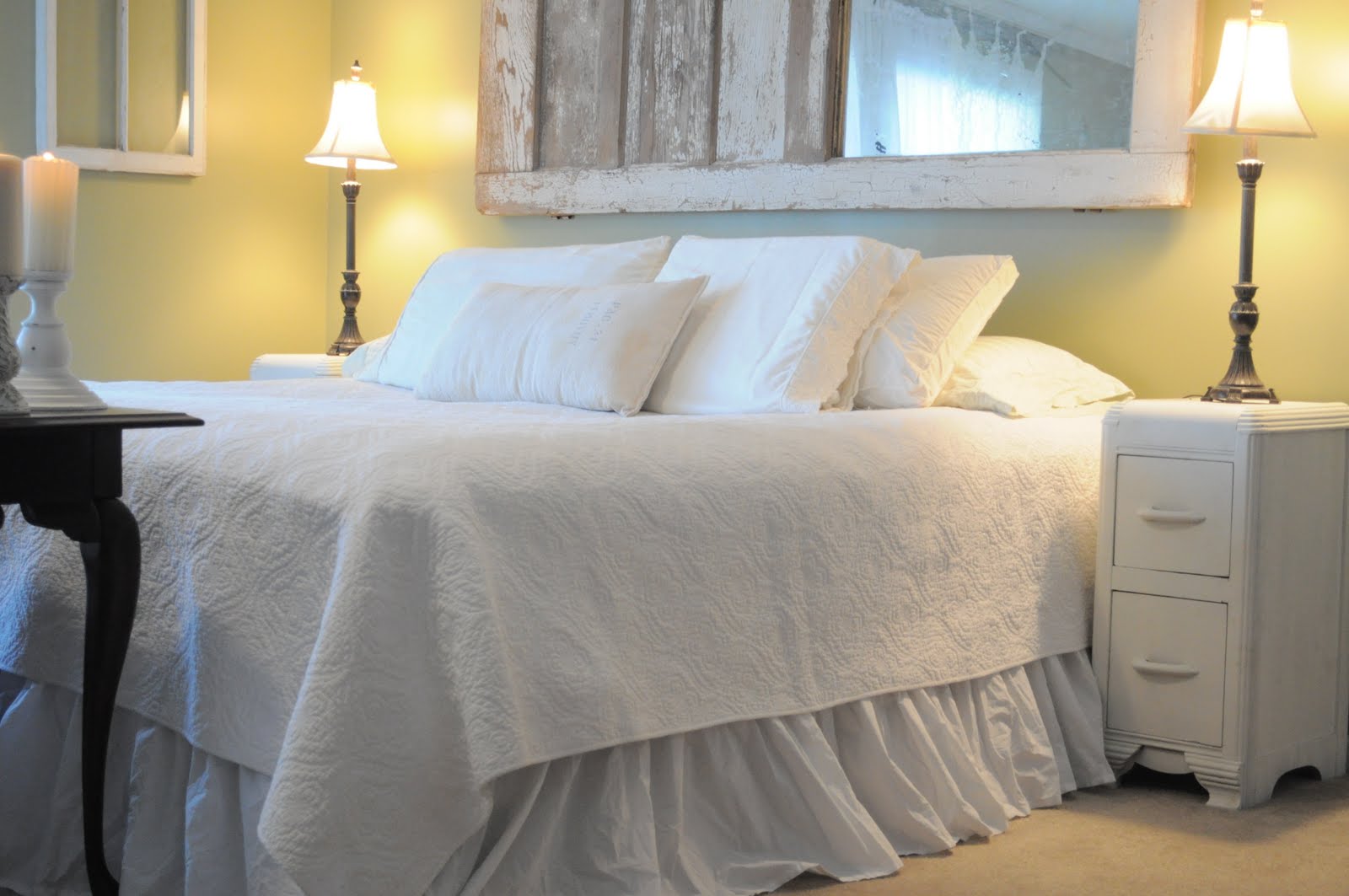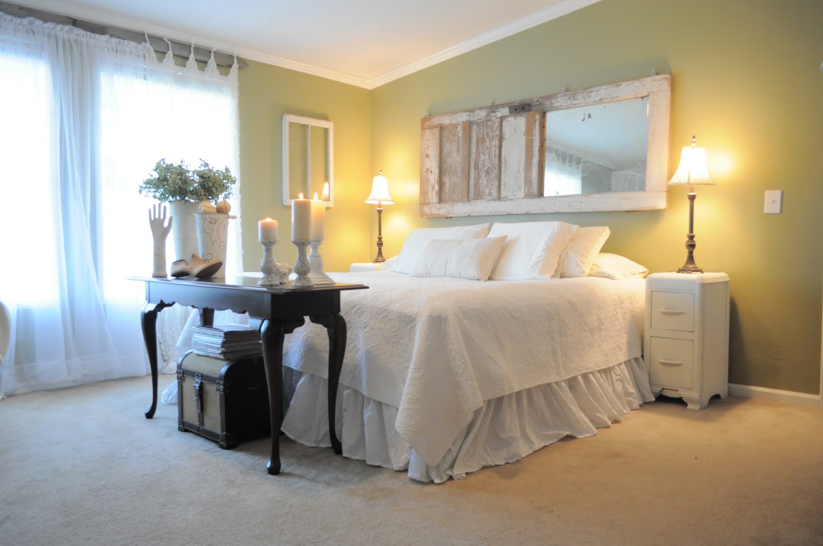 It's stunning as is. I love all the white. I wish I could have white but I have too many kids that crawl on my bed with chocolate milk and dirty shoes. Loving the old door. Your window treatments are fantastic!