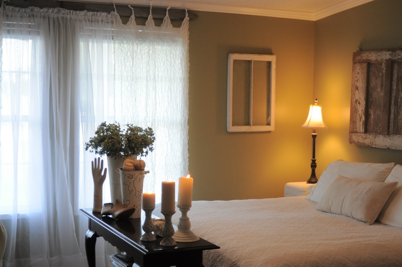 Your bedroom is gorgeous and I love your curtains! I too love using unique items for curtains. I think the room would be beautiful painted white or gray!