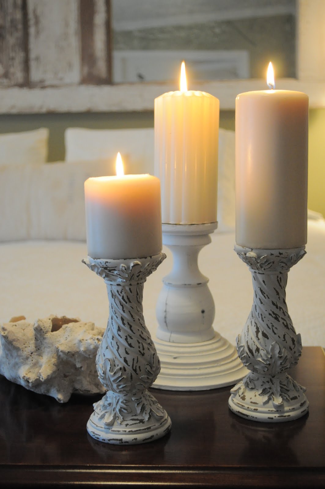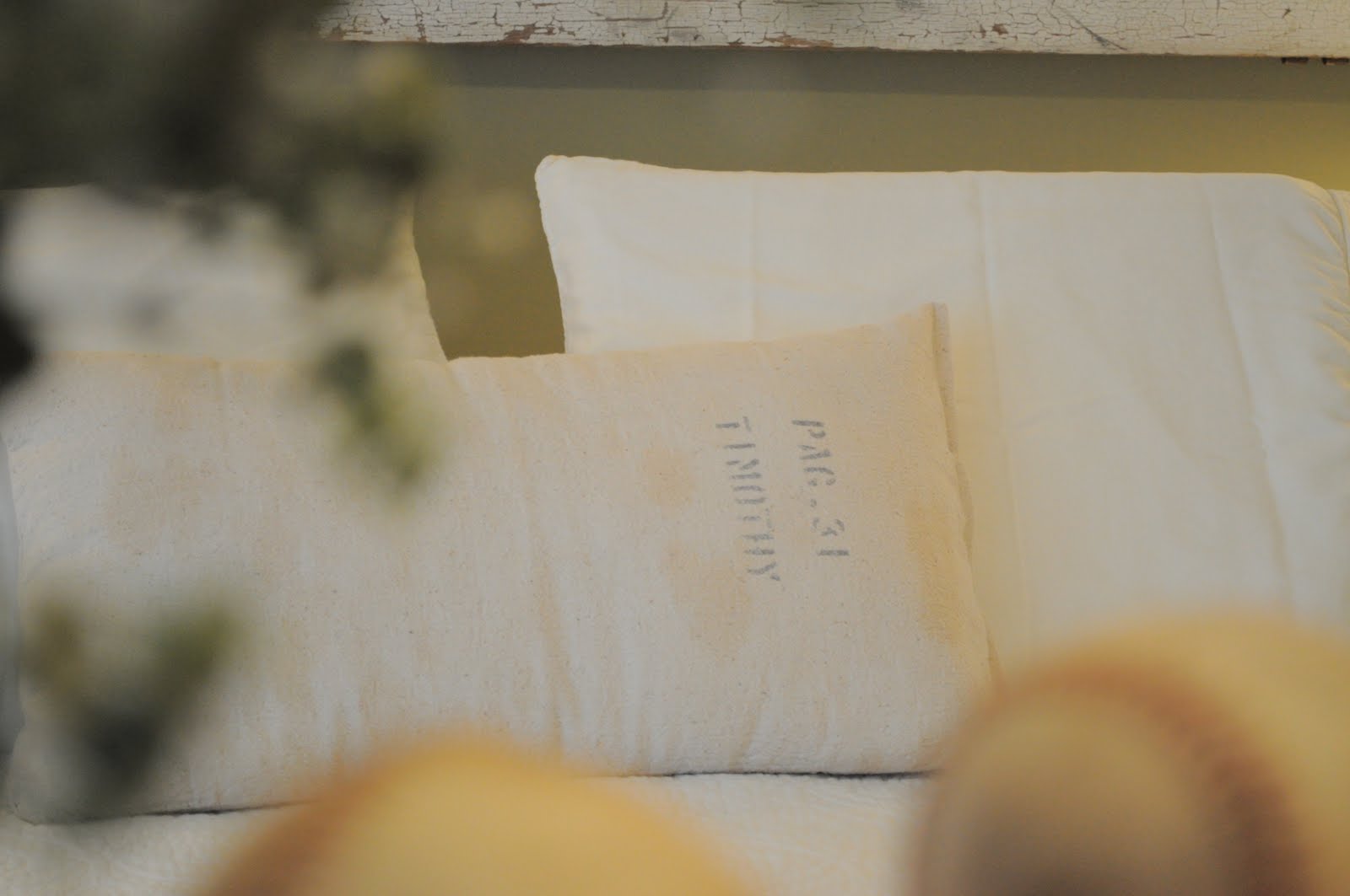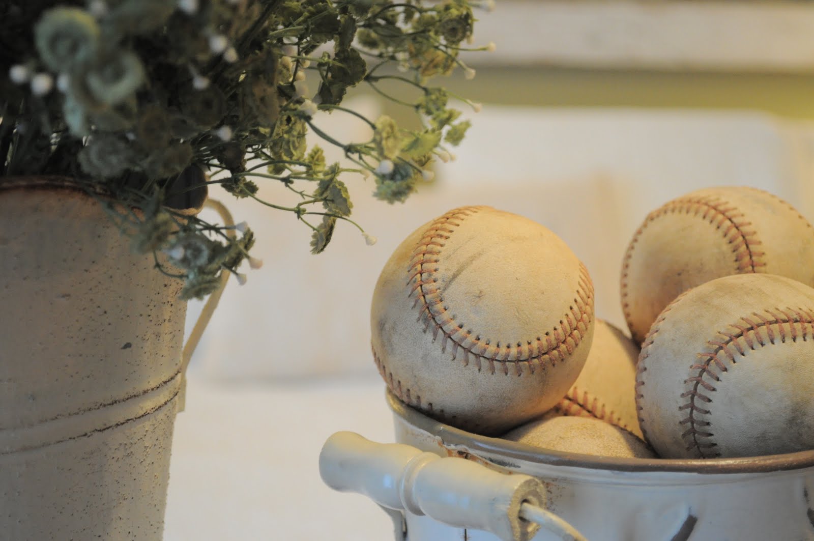What a beautiful and serene bedroom you have! I LOVE the chippy piece above your bed and the picket fence curtain rods… gorgeous!! I also love the bucket of baseballs… a great touch for the hubby. π You know I love an all white room, especially in the bedroom, but really the whole house. π