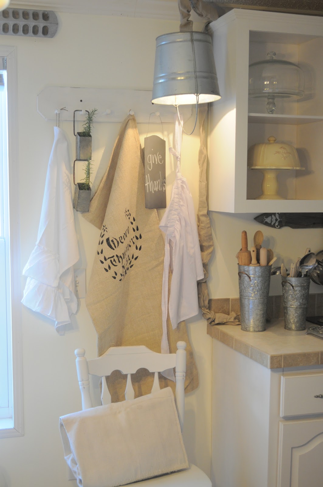 I like your new look. The apron is cute and I love the containers (lack of a better word) that the rosemary and lantana are in. The bucket lamp is a great idea, I've never seen one before. It maybe going on my to do list.