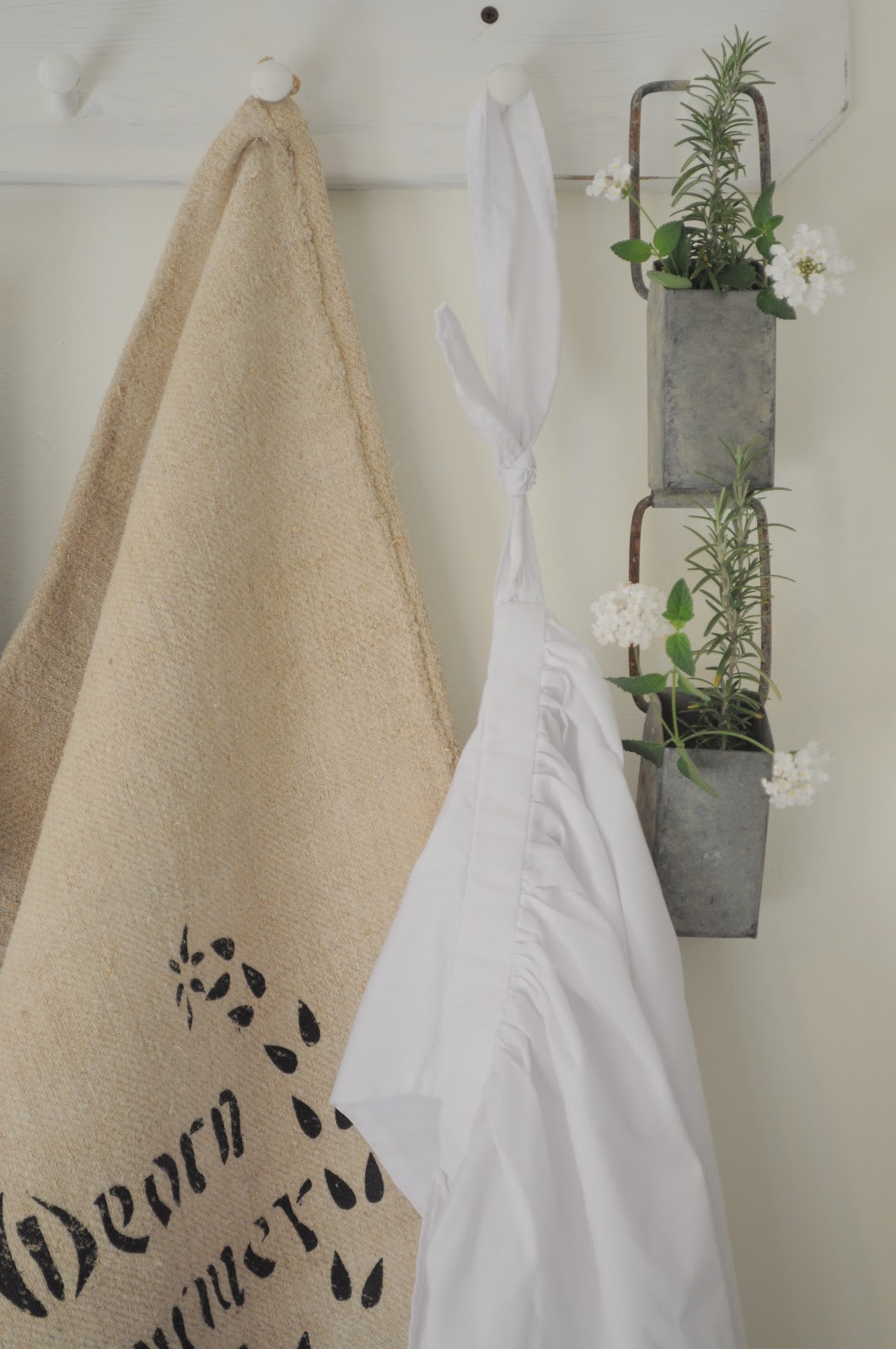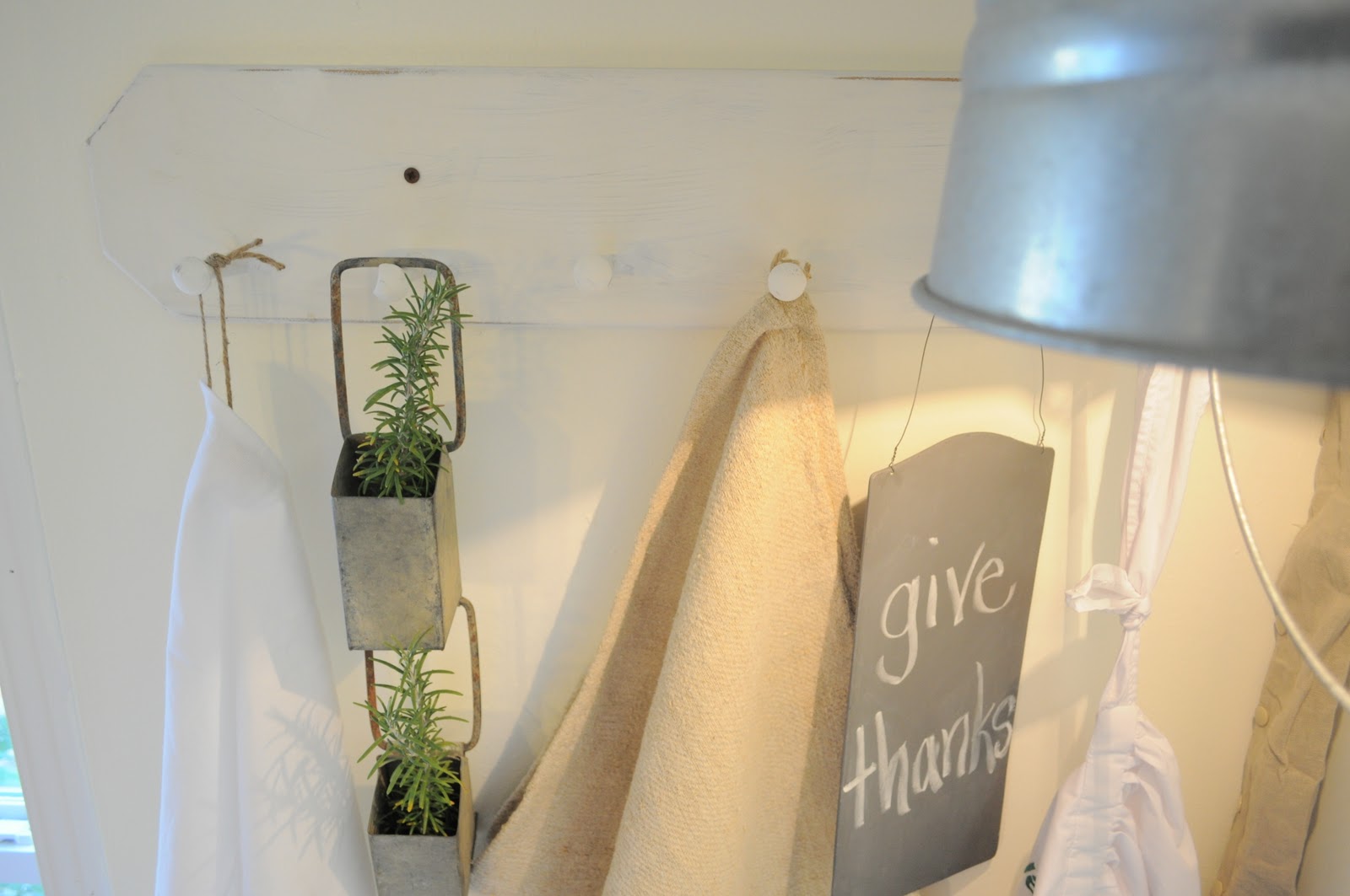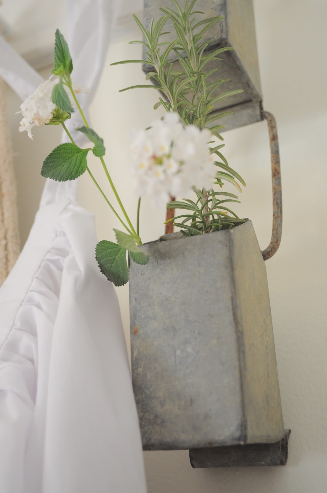 I have to agree with you, Becky… I like this look better, too! I love the hook rack and what you have displayed on it! That little galvanized or zinc thing-a-majig is terrific!! It looks sooo sweet filled with the rosemary and lantana!!