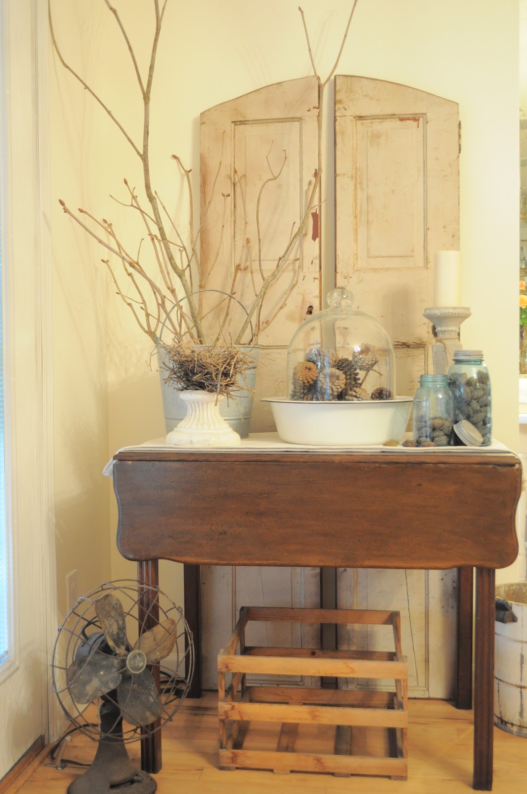 LOVE the paint! Your styling is wonderful to look at! All your woodsy stuff is terrific, and the cloch base is so farmhouse perfect!