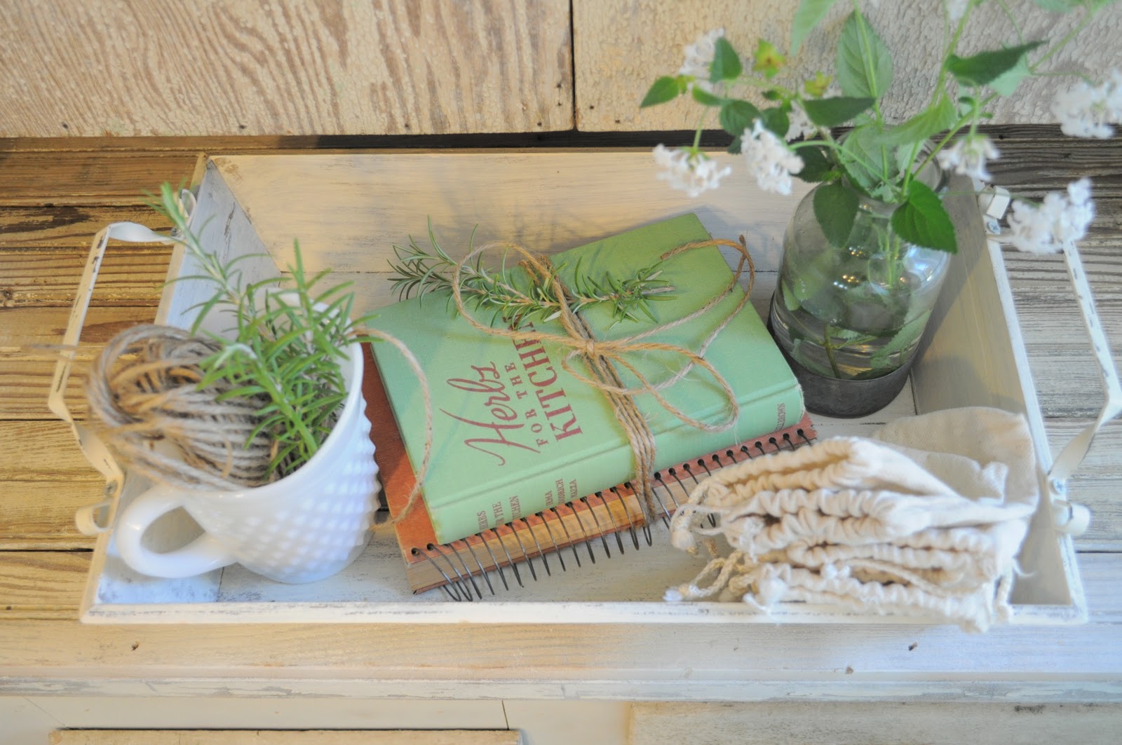 I love your milk glass vase and vintage cookbooks! The sweet vingette you put together on the tray is so pretty.
