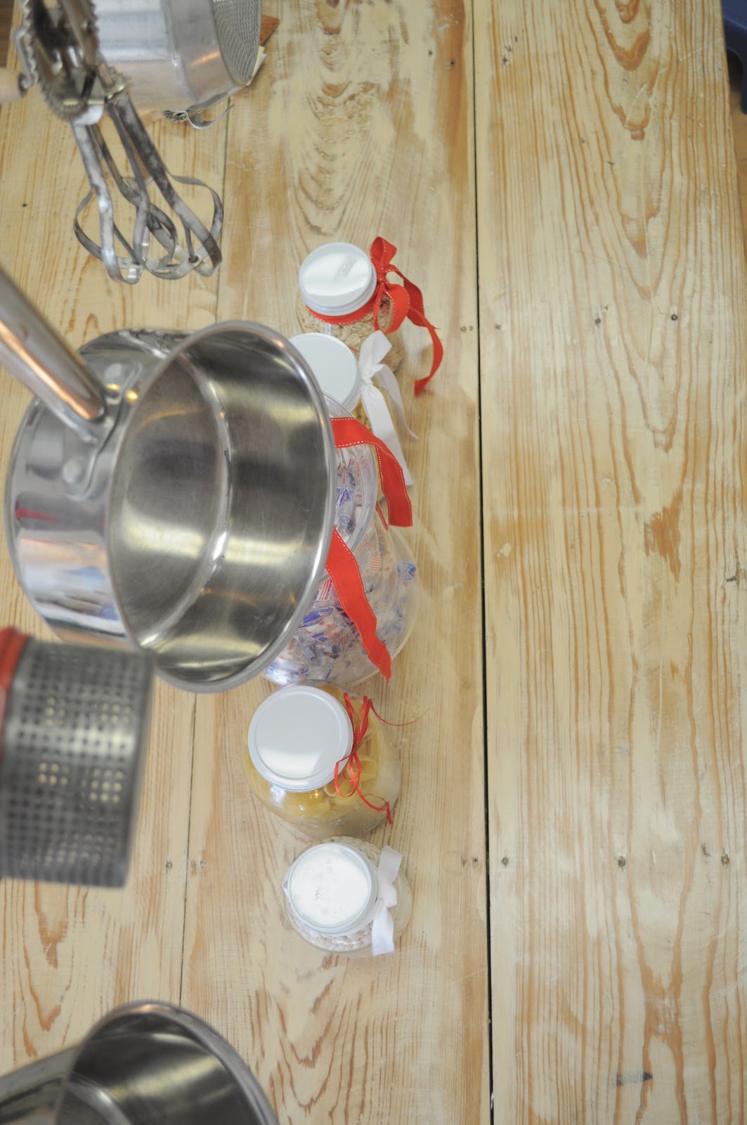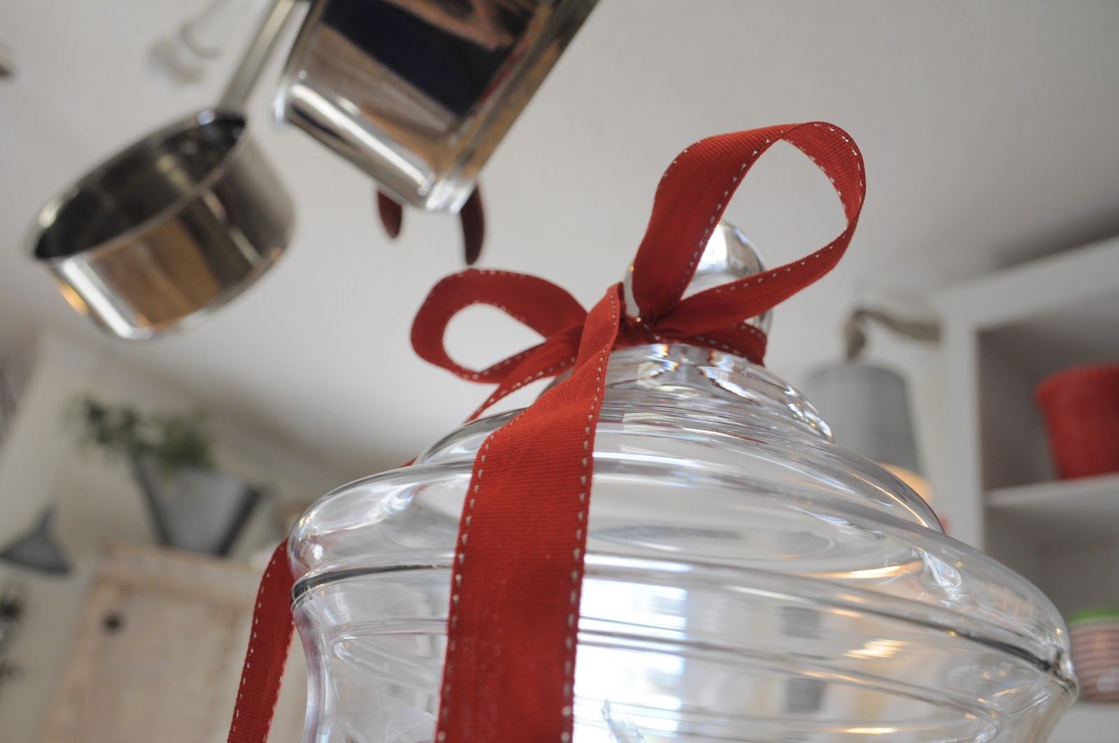 Wonderful idea, love the curtain rod that you used to hang the untensils with! The jar do look wondeful with the red ribbon!