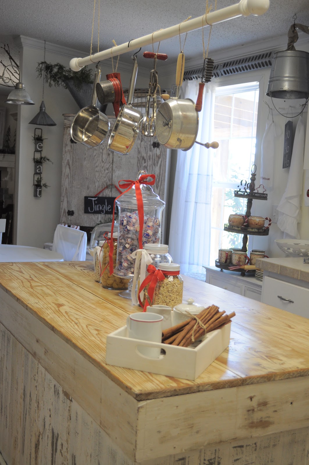 Becky you have done such an amazing job of adding a little Christmas cheer to your island. I love the ribbon on the jar and the hanging vintage utensils. Such a great idea.
