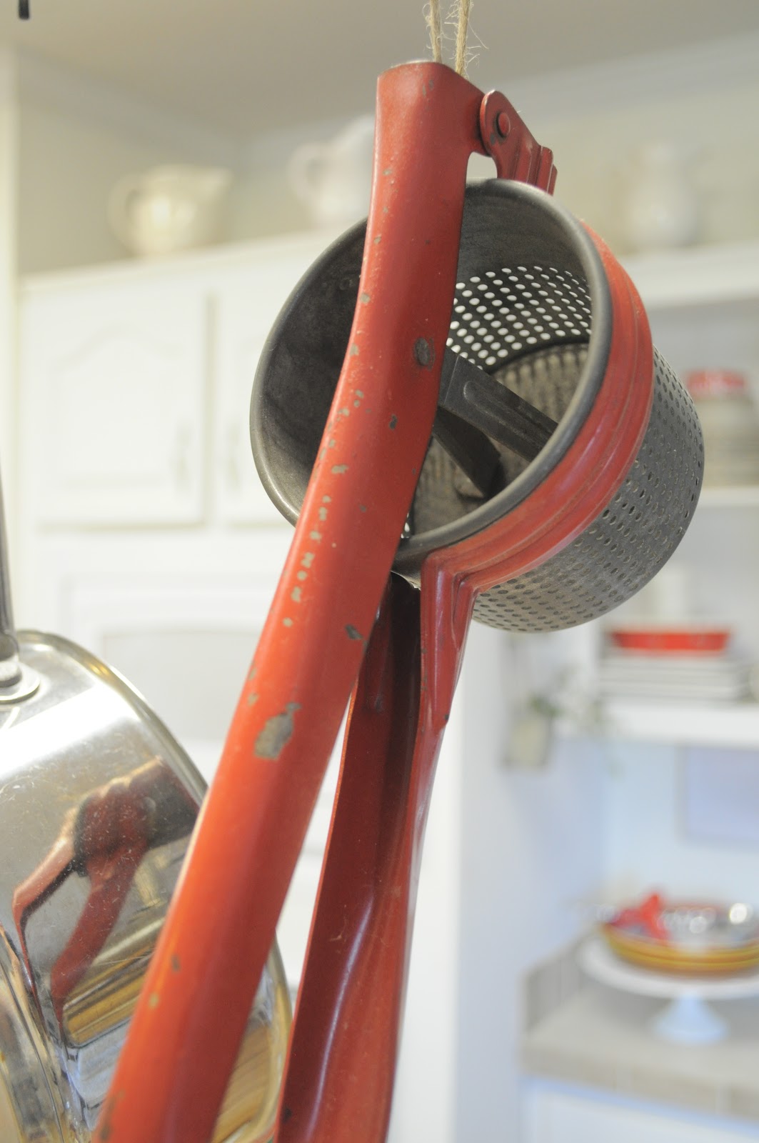 Using twine, I also added old kitchen utensils with wooden red handles
