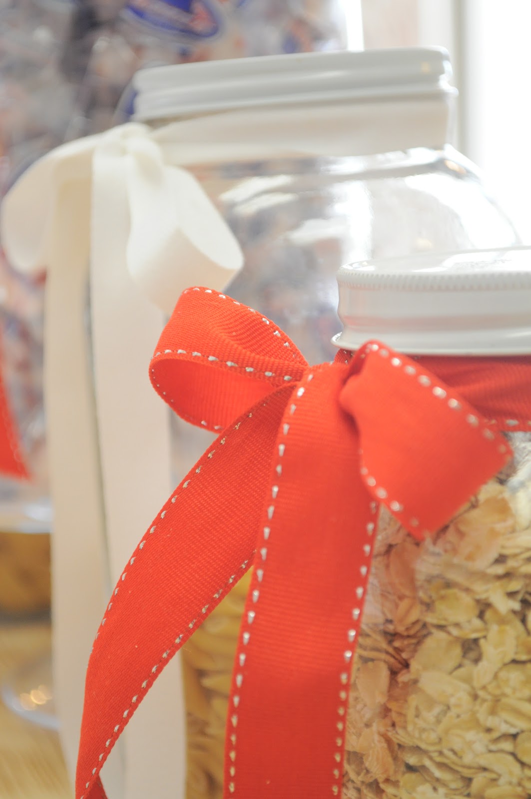 I used plain jars with white lids for staples such as pasta, beans, and oats.