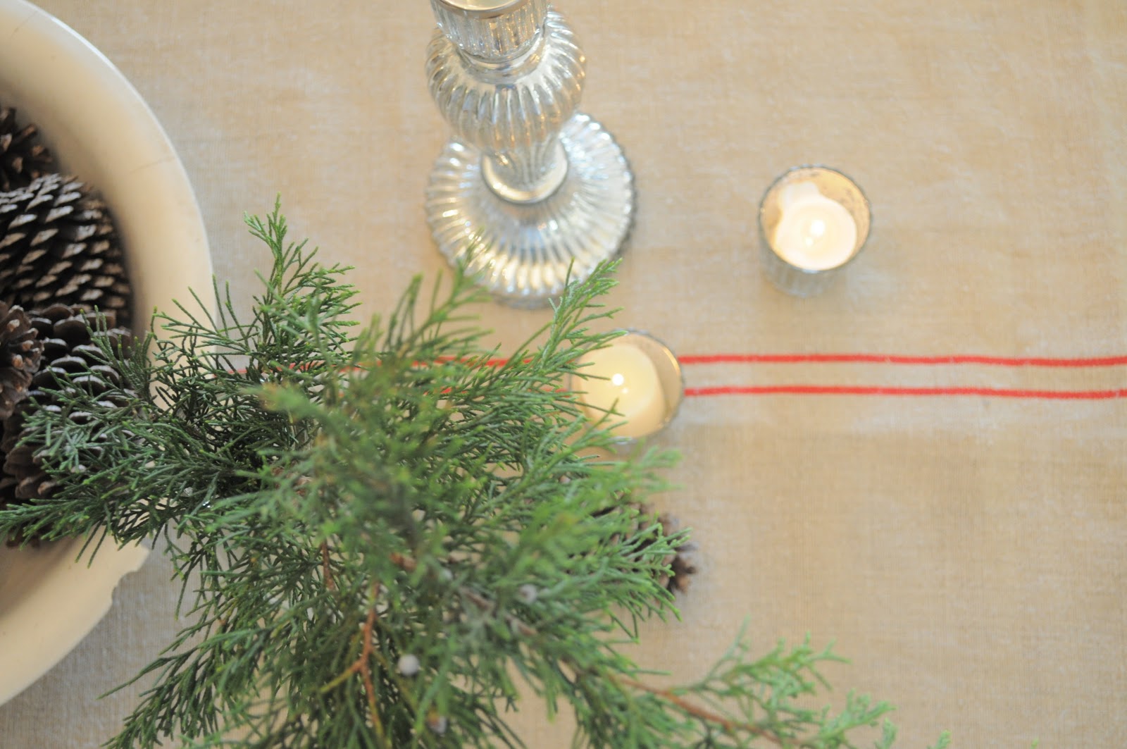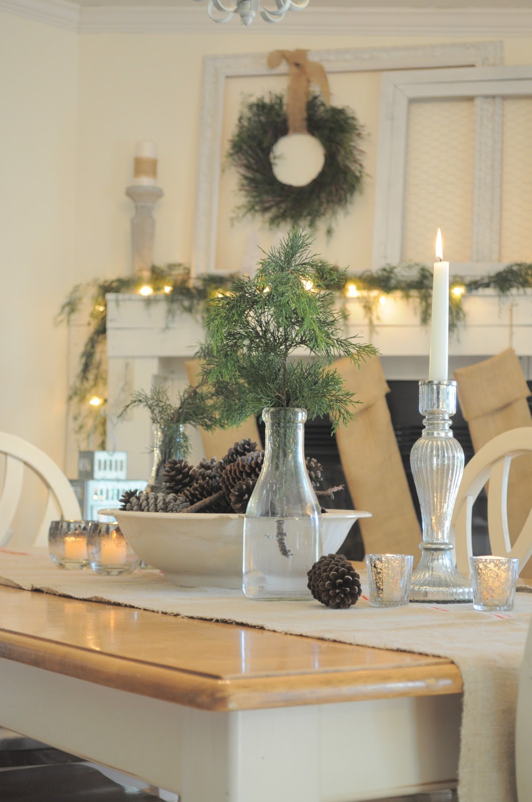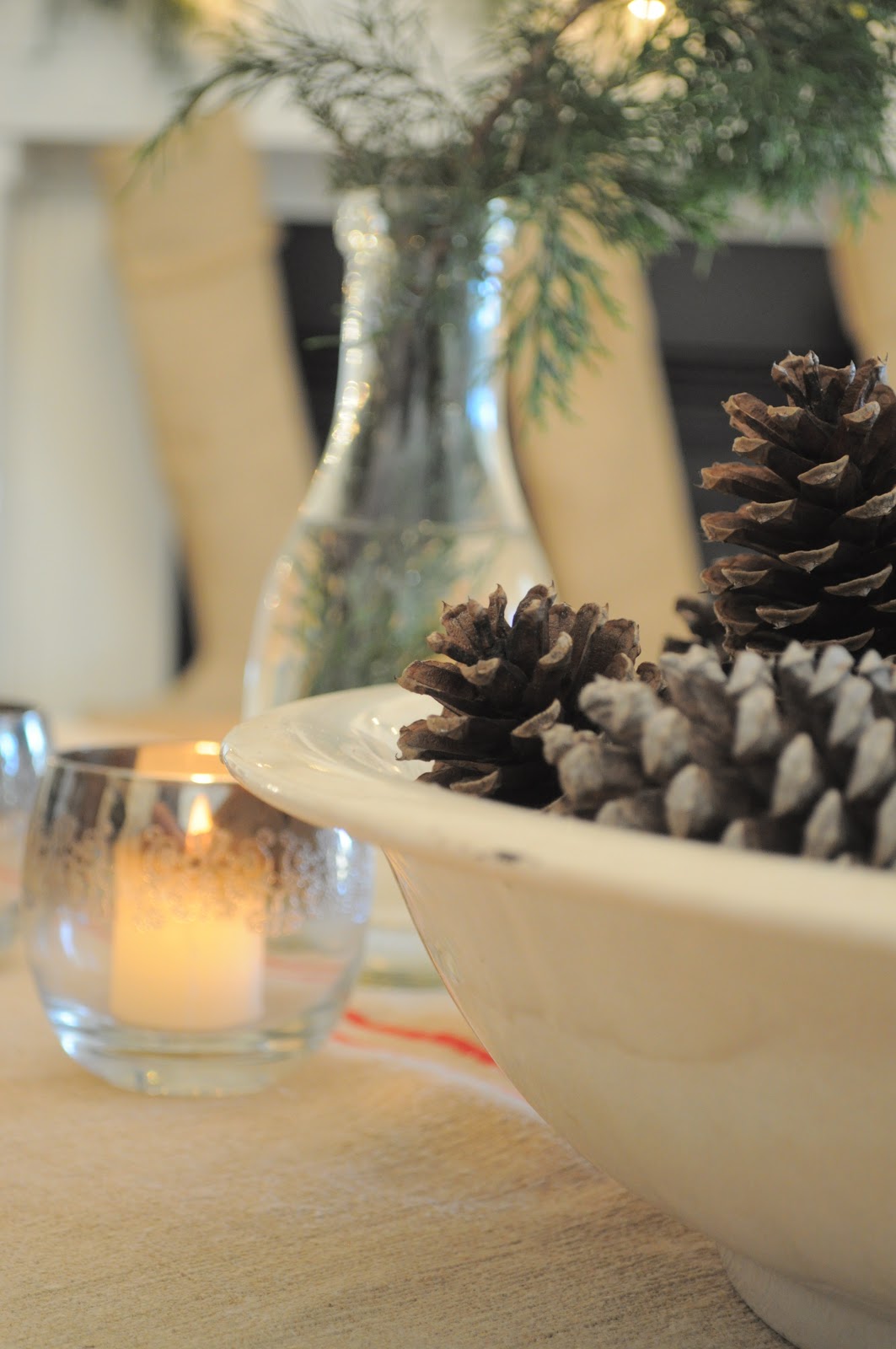 I love your dining room, so simple yet elegant. The grain sack, mercury glass, and pine cones look so good together. Nice job!