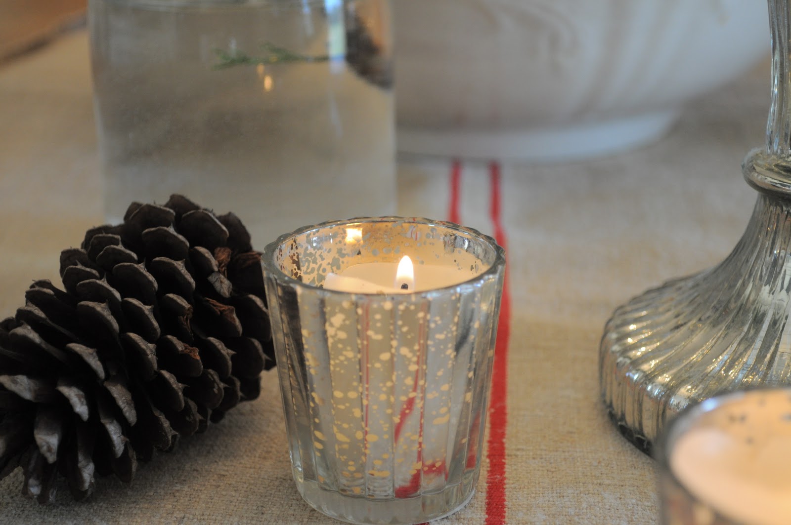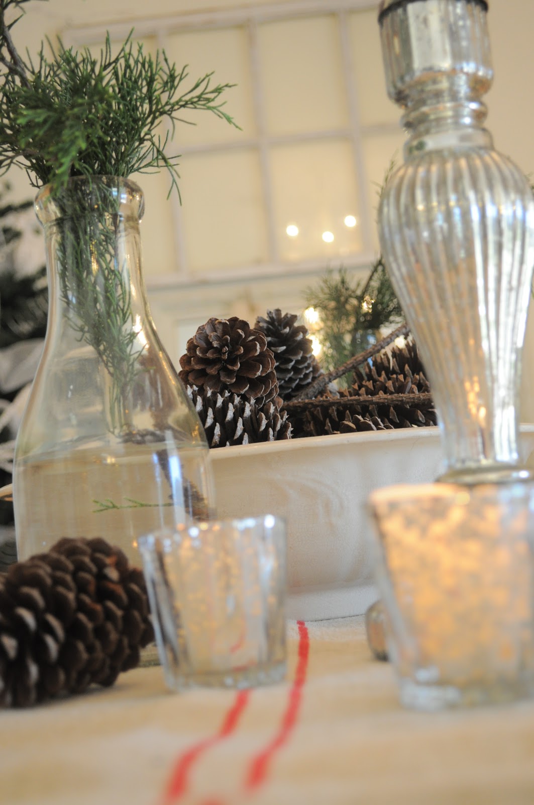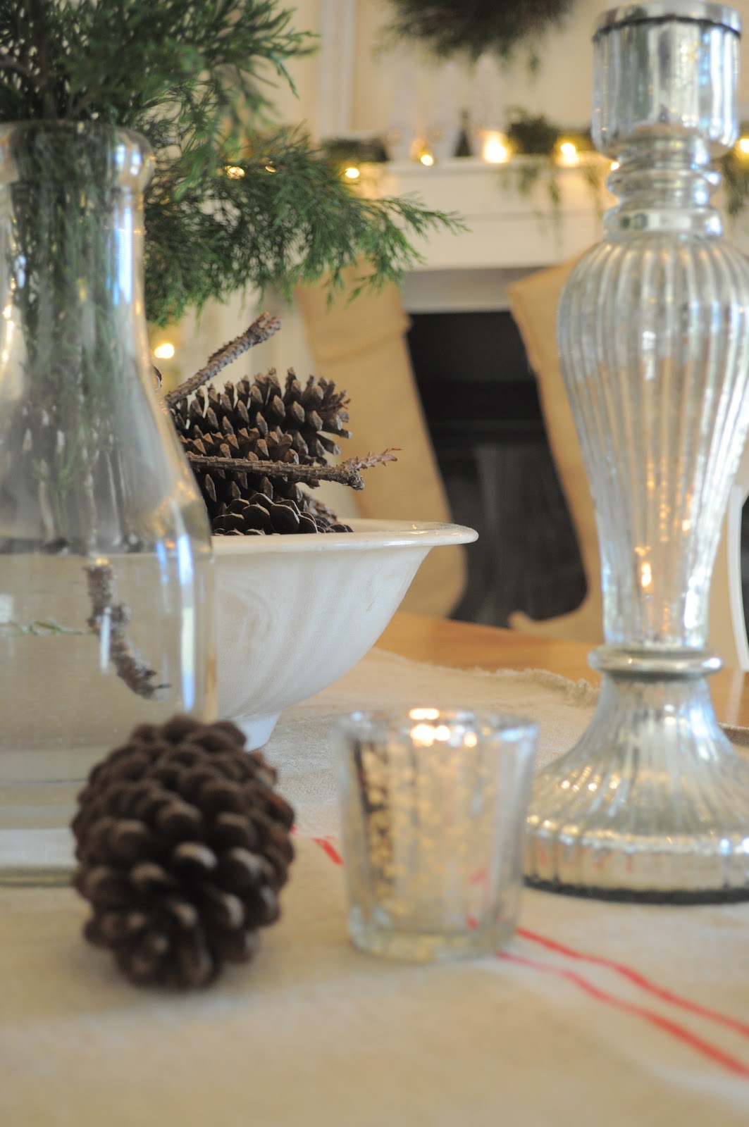 So very pretty. I love the combo of rustic of the pinecones and the sparkle of the mercury glass. The whole room looks amazing. Very well done!