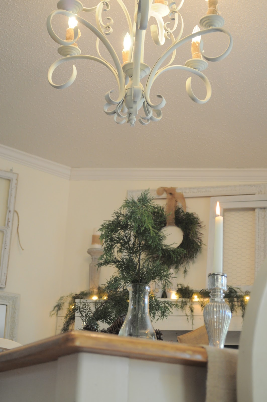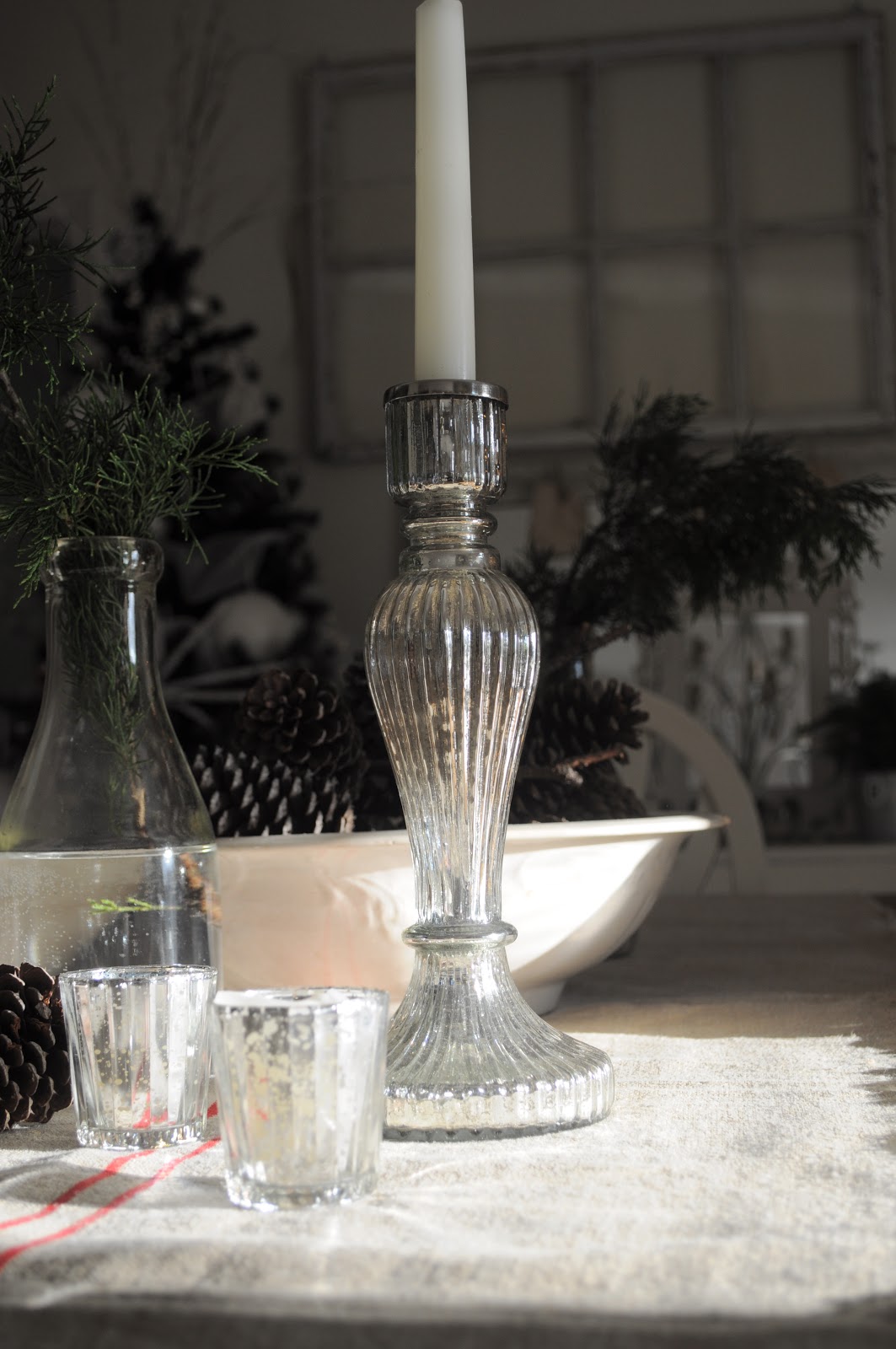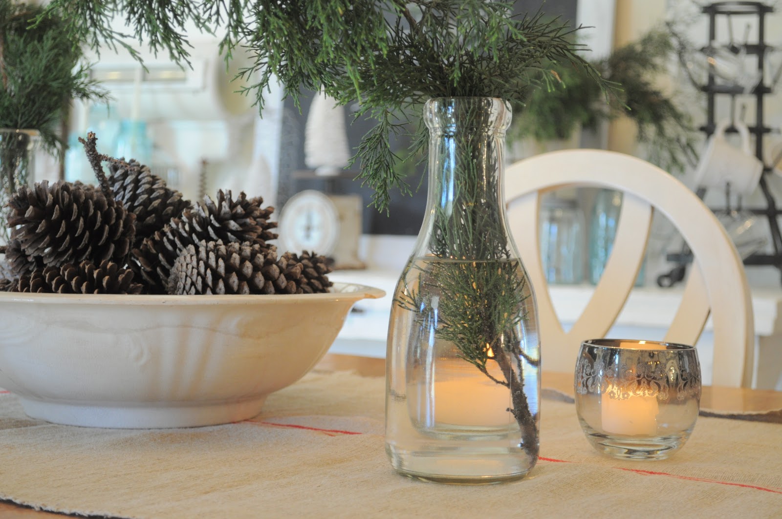 So very pretty. I love the combo of rustic of the pinecones and the sparkle of the mercury glass. The whole room looks amazing. Very well done!