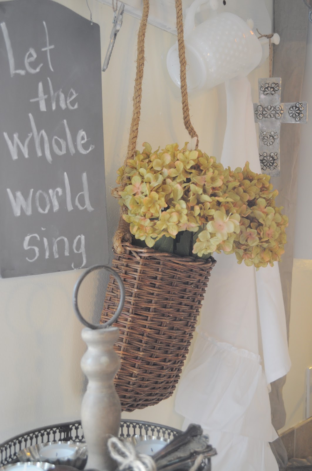 Looks like you had fun playing with your new treasures! Love your tablescape and all the vignettes! I have that same milkglass pitcher you have hanging on the peg. I actually have about 75 pieces of milkglass I collected this year for my oldest daughters wedding. She wanted each table centerpiece to have 5 pieces of milkglass in the center filled with various natural decor. Love all your creative uses for simple things especially the bed springs! So ingenious! Thanks for sharing your beautiful home. Blessings and happy homeschooling!