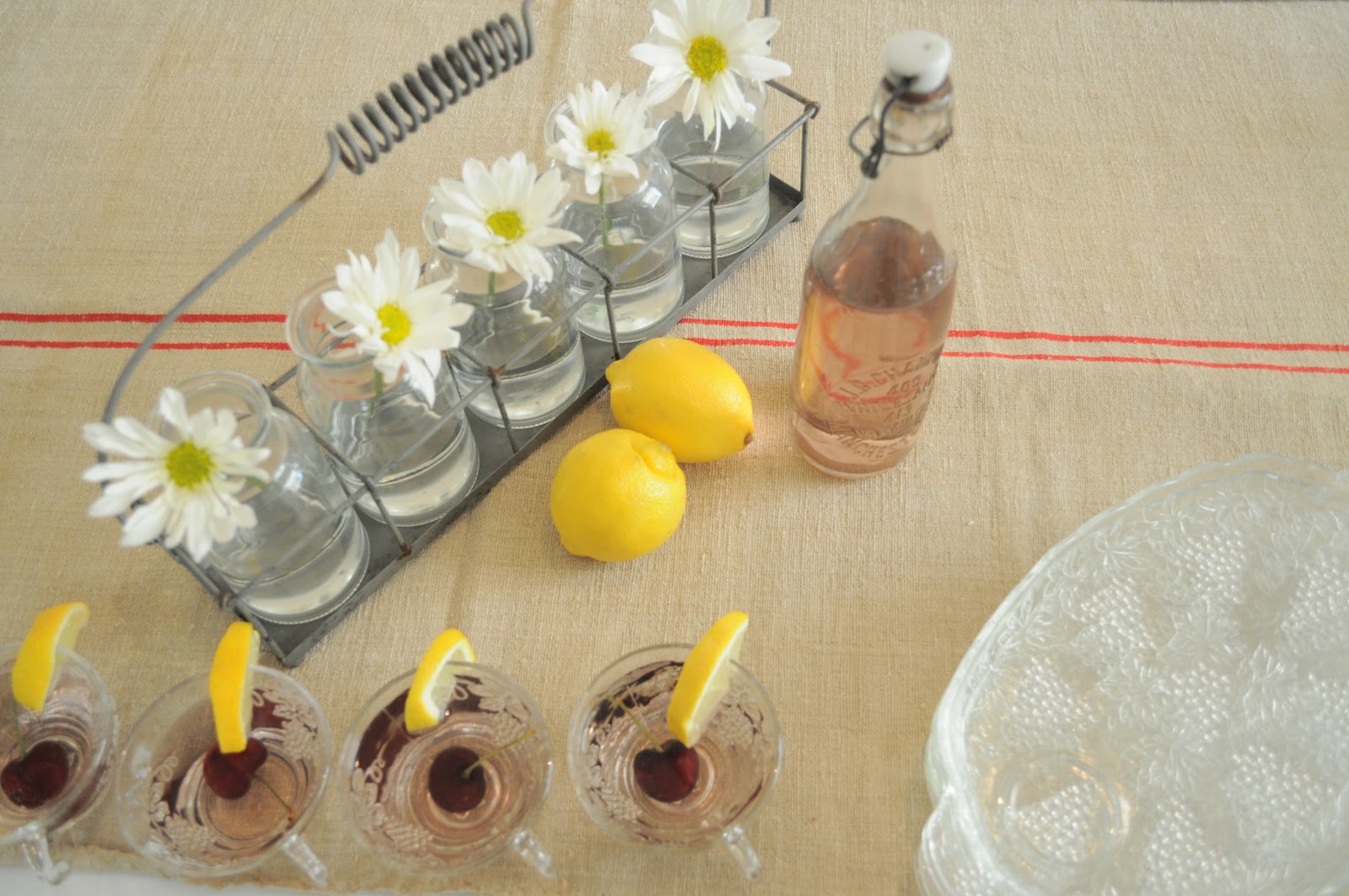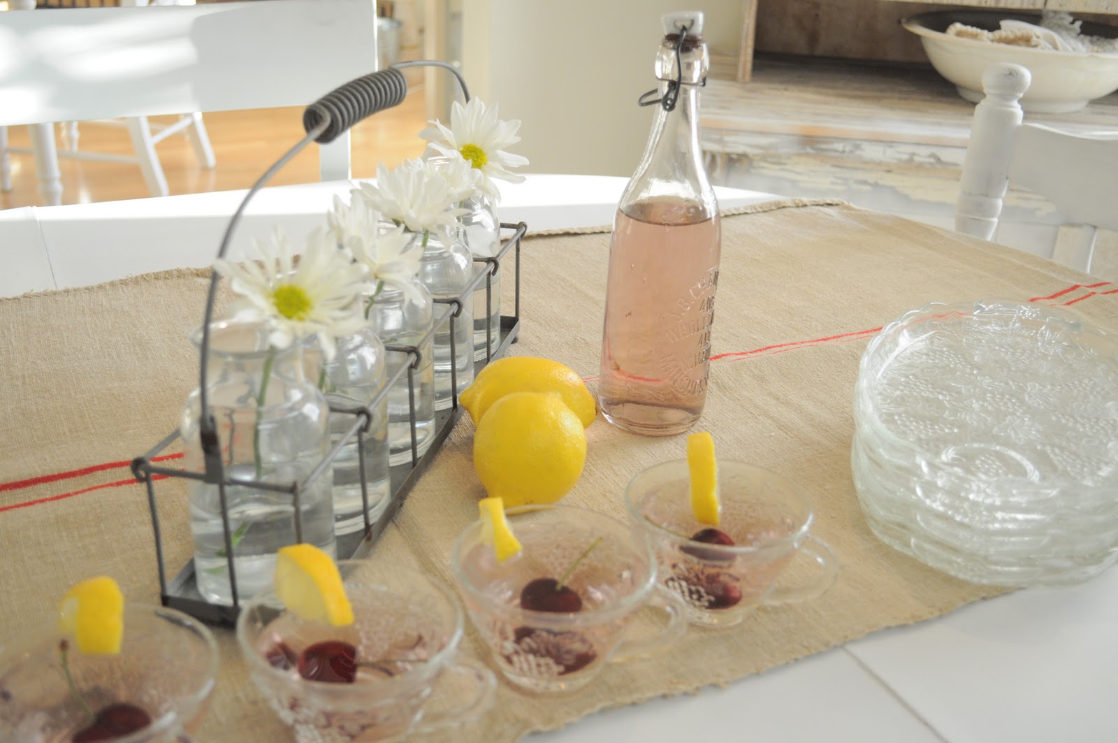 Your daisies are sweet, Becky. I love your pretty tablescape. The cherries in the bottom of your glasses are a nice touch… love that.