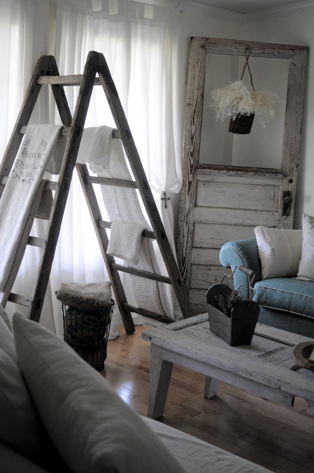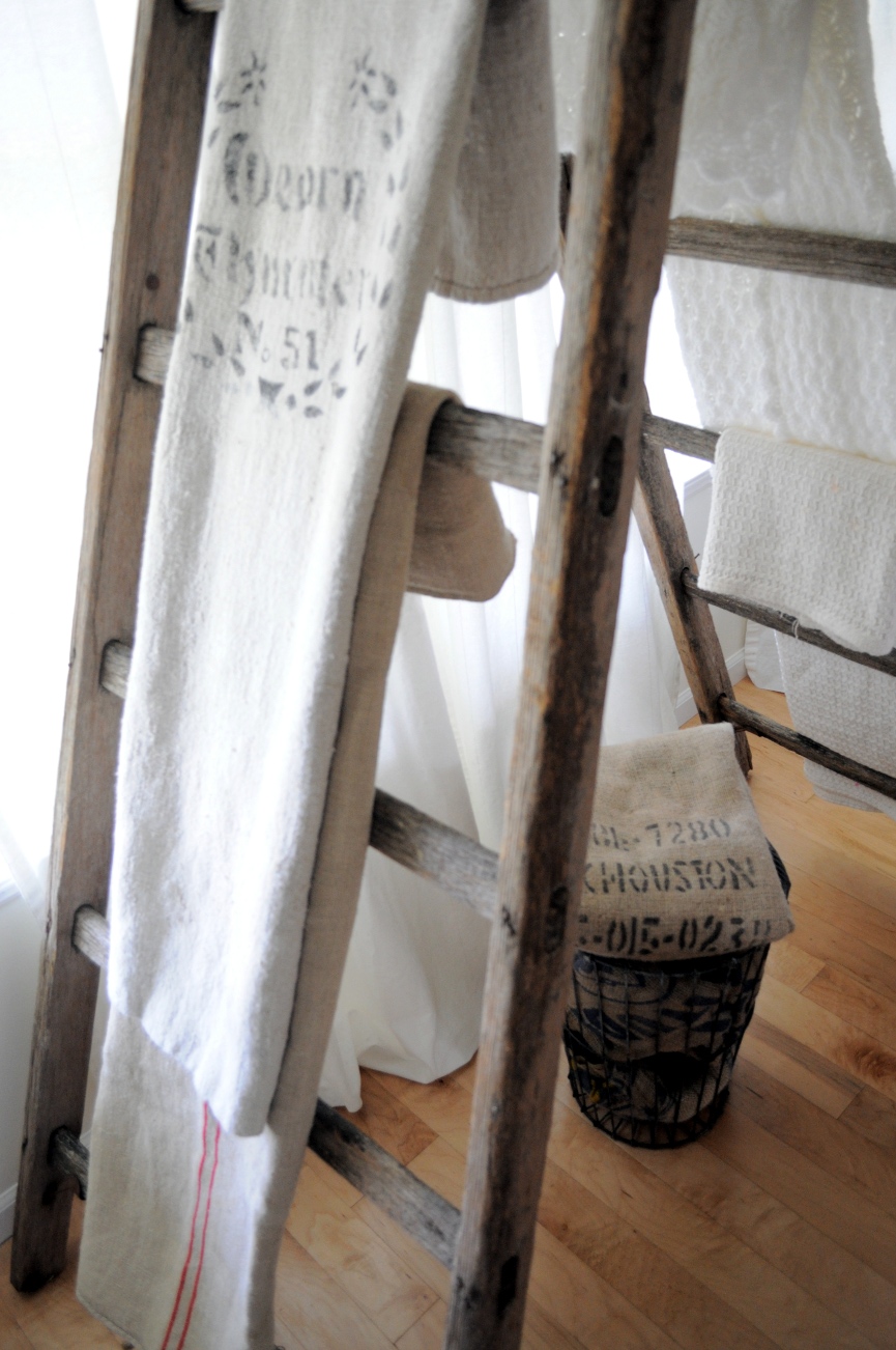 I hung a few grain sacks and special baby blankets on the rustic ladder.