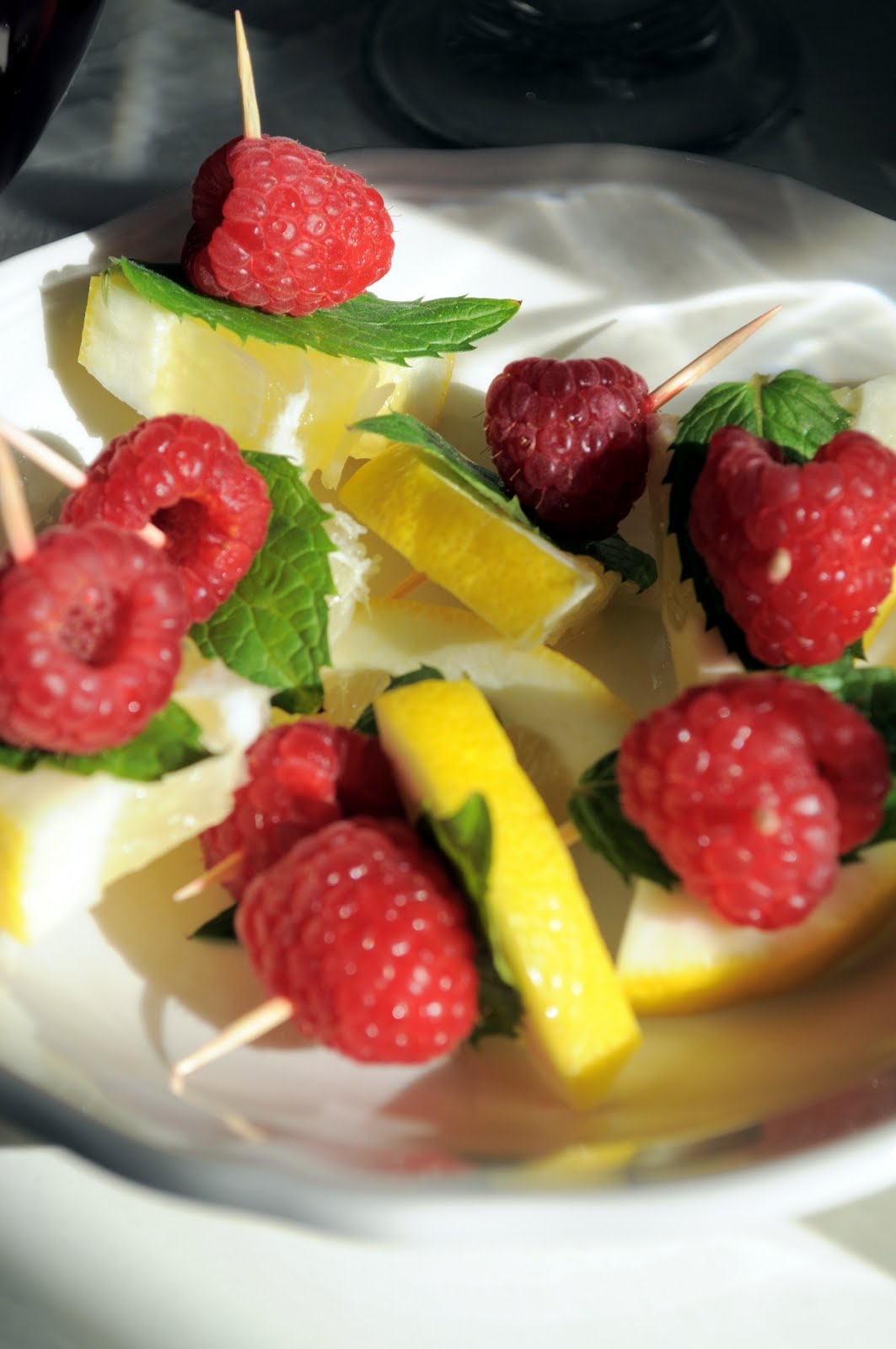And a little skewer of lemon, mint, and raspberries for your glass.