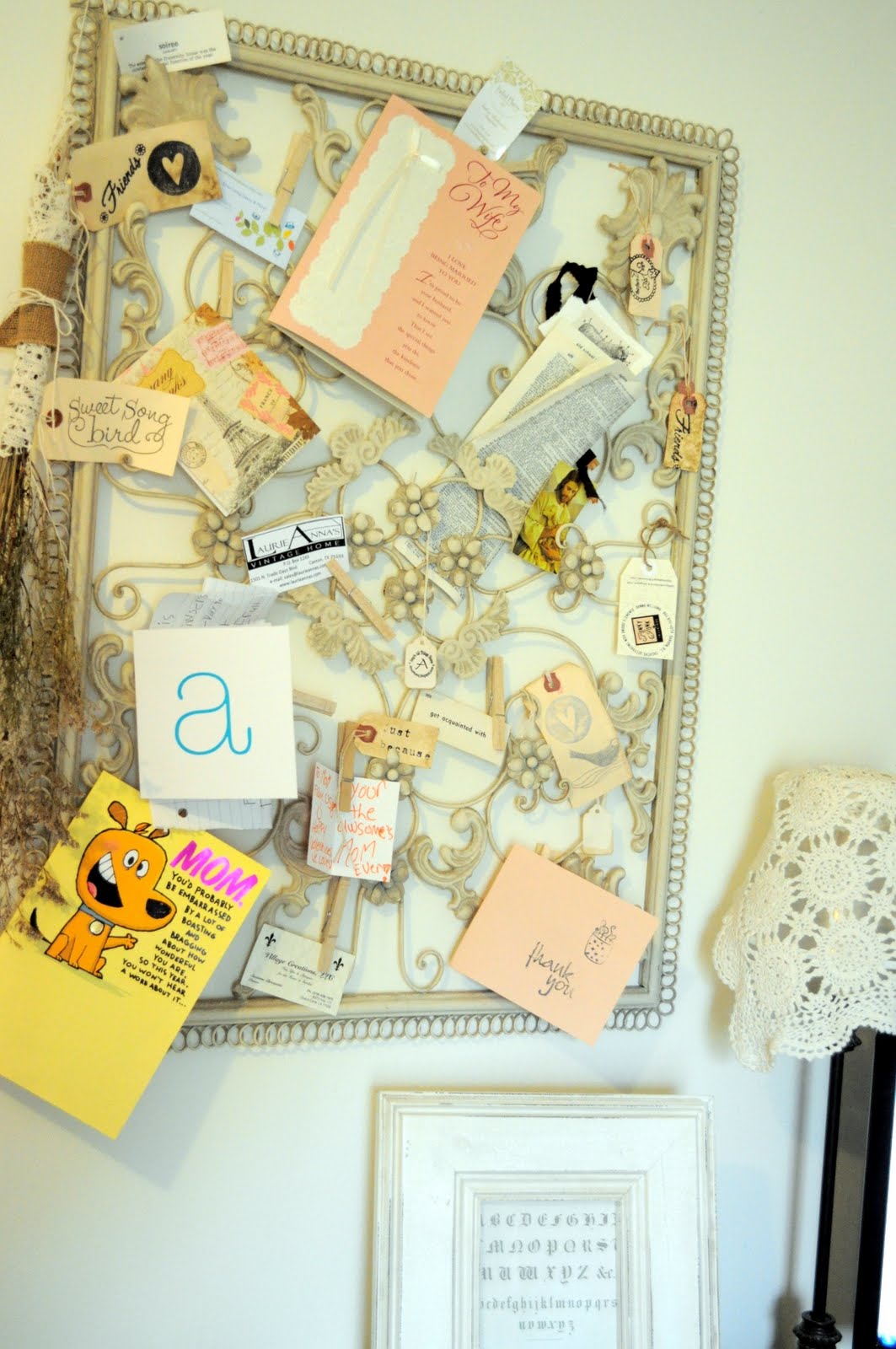 I love the layers of fabrics and ribbons. I love the old doors and windows. I love the scrolly thing that holds your cards and letters. I LOVE that song that you have on your chalkboard. I love it ALL!!