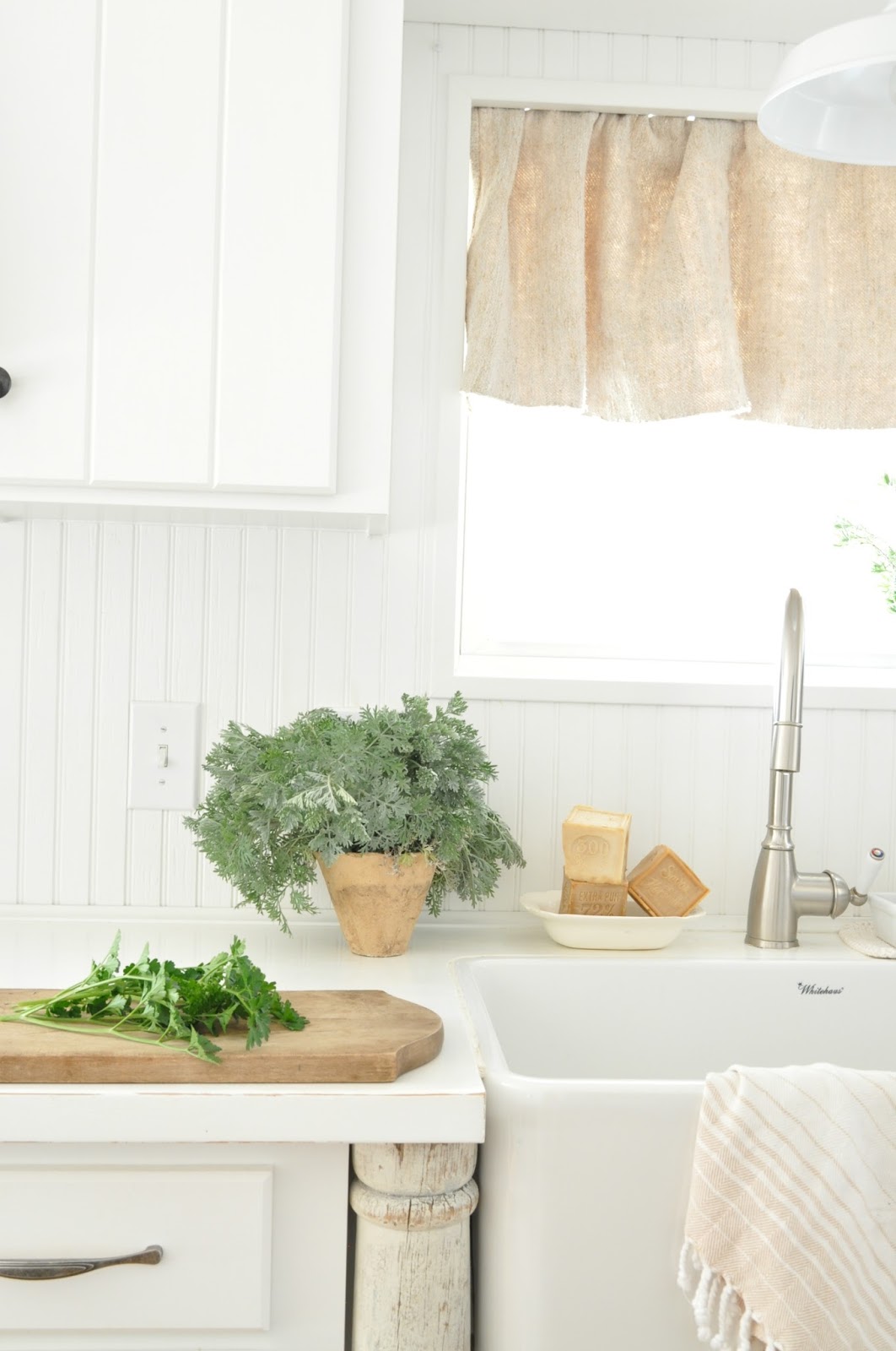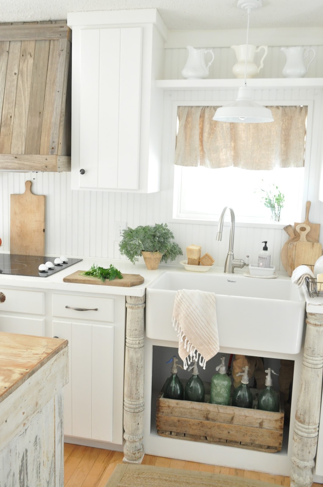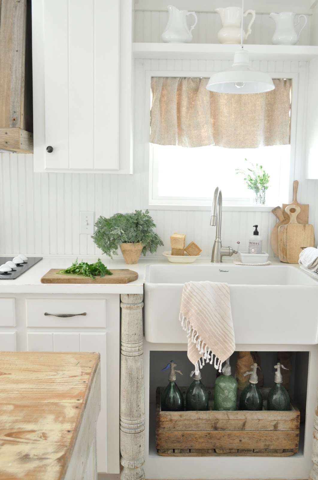 I love the shelf above the sink but you've made an almost always "ugly" utilitarian space absolutely beautiful with your under the sink display. Why shouldn't we make everyday necessities pretty. Burlap around the pipe is so creative. Great job. Love it all.