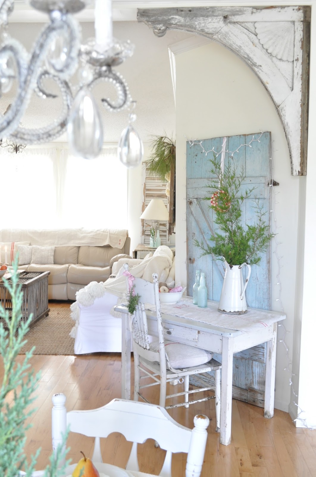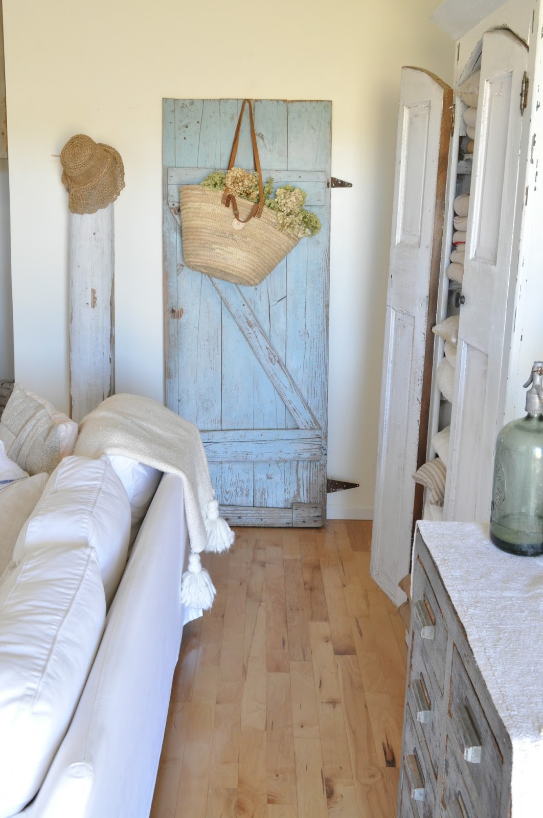 A pretty pale blue barn door leaned against the wall also serves as artwork…